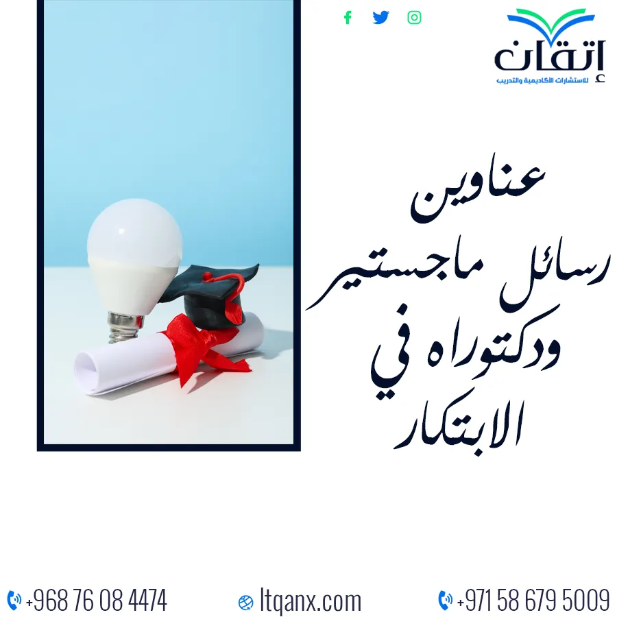 وفي الختام يظل الابتكار علامة فارقة في بناء المعرفة، ودفع مسيرة البحث العلمي نحو آفاق أوسع، وإن استعراض عناوين رسائل ماجستير ودكتوراه في الابتكار يفتح أمام الباحثين مسارات جديدة تعكس طموحاتهم وتدعم رؤيتهم المستقبلية، ومن هذا المنطلق تقدم شركة إتقان للاستشارات الأكاديمية والتدريب خبرتها في اقتراح العناوين وصياغة البحوث الجامعية، بما يضمن للباحث التميز والريادة؛ وذلك مع توفير دعم متكامل يمكنه من تحويل فكرته إلى إنجاز أكاديمي متكامل، ولمن يسعى للانطلاق بخطوة واثقة، فإن فريقنا على الواتساب جاهز ليكون شريكك في رحلة النجاح.