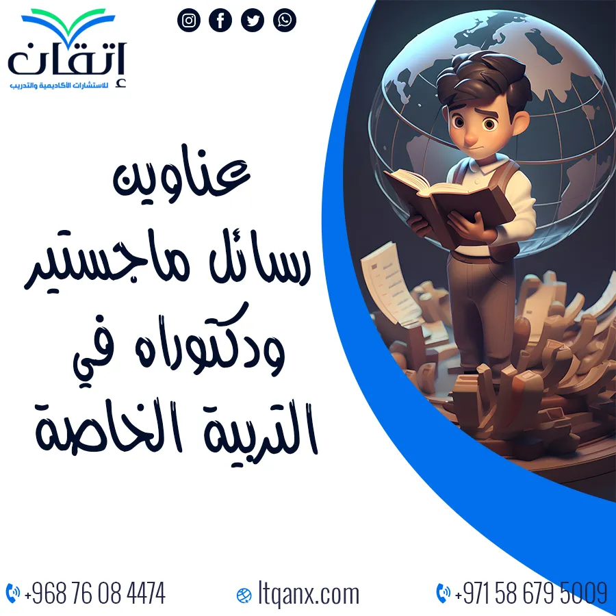 وفي النهاية تظل التربية الخاصة رسالة إنسانية وعلمية في آن واحد، تسعى إلى بناء مستقبل أكثر شمولًا وعدالةً لجميع فئات المجتمع، ومن هنا تأتي قيمة اختيار عناوين رسائل ماجستير ودكتوراه في التربية الخاصة بعناية؛ لتكون البداية الحقيقية نحو أبحاث تترك أثرًا ملموسًا في تطوير هذا الميدان، وإذا كنت تبحث عن دعم متخصص يوجهك في إعداد بحوثك واقتراح عناوين مبتكرة تتوافق مع متطلبات رسالتك، فإن شركة إتقان للاستشارات الأكاديمية والتدريب تضع بين يديك خبرتها لتضمن لك النجاح والتميز، وللتواصل المباشر والحصول على استشارات مخصصة يمكنك التواصل معنا عبر الواتساب.