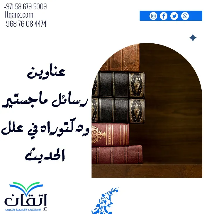 وفي الختام بعد عرض قائمة مميزة لأحدث عناوين رسائل الماجستير والدكتوراه في علل الحديث، نسأل الله العلى العظيم بالتوفيق لجميع الباحثين، وإذا أردت في أي وقت معرفة عناوين لرسالتك العلمية، كل ما عليك هو الاعتماد على شركة "إتقان" للاستشارات الأكاديمية والتدريب، يوجد لدينا نخبة من المتخصصين في هذا المجال، يمكنك التواصل معنا عبر الواتساب.