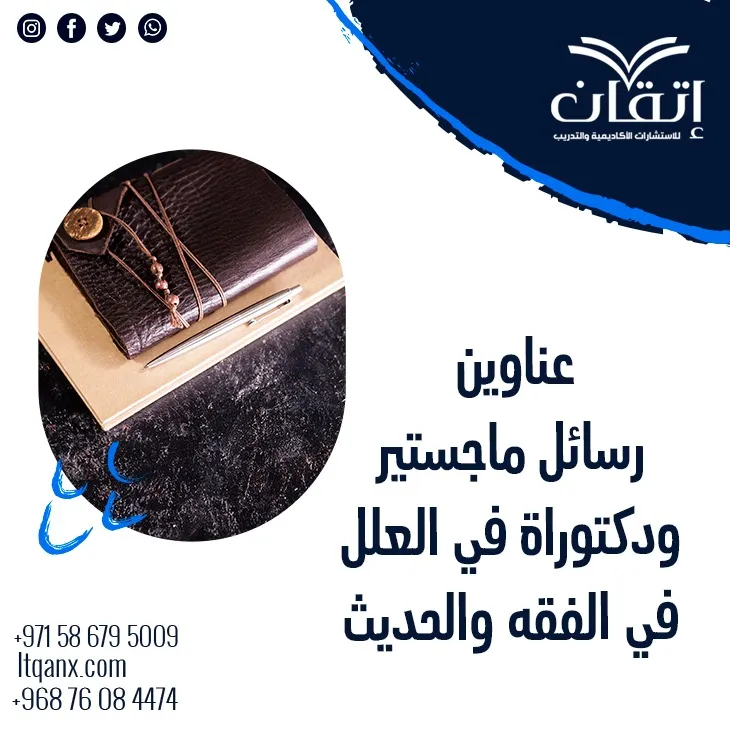 في النهاية، نكون قد استعرضنا مجموعة أفكار بحثية لـ أحدث عناوين رسائل ماجستير ودكتوراة في العلل في الفقه والحديث، وذلك لما لهذا الموضوع من أهمية كبيرة في توسيع آفاق البحث العلمي؛ وإذا كنتم تبحثون عن دعم متخصص لإعداد رسالتكم العلمية، يمكنكم الاعتماد على خدمات شركة "إتقان" للاستشارات الأكاديمية والتدريبة، التي توفر نخبة من الأساتذة المتخصصين في العلوم الشرعية، والذين يقدمون مساعدة احترافية بمستوى عالٍ من الجودة، فقط تواصلوا معنا عبر الواتساب، وسيتم الرد عليكم في أسرع وقت.