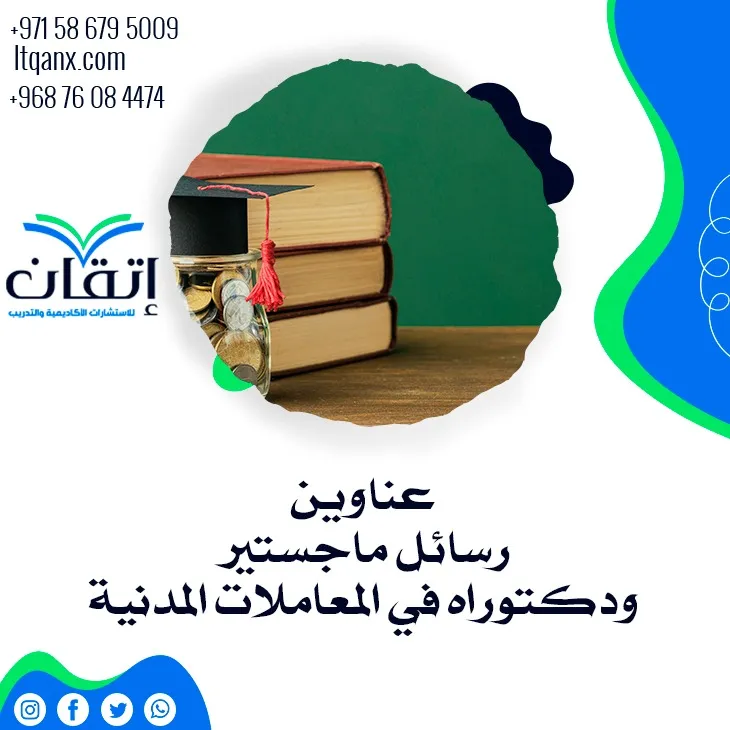 وفي الختام يتضح أن المعاملات المدنية تتميز بتوسع كبير في الموضوعات البحثية، خاصة مع التطور التكنولوجي والتحول الرقمي الذي يشهده المجتمع الدولي، وقد قدمت لكم شركة إتقان للاستشارات الأكاديمية والتدريب أهم عناوين رسائل ماجستير ودكتوراه في المعاملات المدنية، كما تقدم خدماتها في إعداد الرسائل العلمية بشكل احترافي عن طريق نخبة من الأساتذة المتخصصين، كل ما عليك هو التواصل معنا عبر الواتساب، وسيتم الرد عليكم في أسرع وقت.