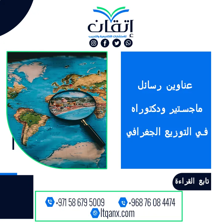 وفي الختام يبقى الاهتمام بـ عناوين رسائل ماجستير ودكتوراه في التوزيع الجغرافي خطوة جوهرية لكل باحث يسعى إلى إنتاج معرفة رصينة تثري مجاله العلمي، وهنا تبرز شركة إتقان للاستشارات الأكاديمية والتدريب بوصفها شريك النجاح والتميز الأكاديمي؛ حيث إنها توفر لك الدعم المتكامل الذي تحتاجه للانطلاق بثقة في رحلتك البحثية؛ لذلك لا تتردد في التواصل عبر تطبيق الواتساب بكل سهولة للحصول على المساعدة والاستشارات التي ترشدك نحو اختيار موضوعك وصياغة مشروعك البحثي بأعلى درجات الاحتراف.