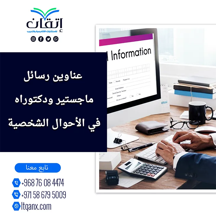 في ظل التحولات الاجتماعية المتسارعة وتنوع القضايا الأسرية يبرز علم الأحوال الشخصية كركيزة أساسية لفهم حقوق الأفراد وتنظيم علاقاتهم داخل المجتمع، ومن إدراك شركة إتقان للاستشارات الأكاديمية والتدريب لأهمية هذا المجال للباحثين حرصت بفريقها المتميز وكفاءتها الإبداعية على تقديم باقة حصرية تضم عناوين رسائل ماجستير ودكتوراه في الأحوال الشخصية تنتقى بعناية لتساعد الباحث على اختيار موضوع بحثي ثري معزز بالحداثة والتطبيق العملي، ومواكب لاحتياجات المجتمع القانونية المعاصرة.