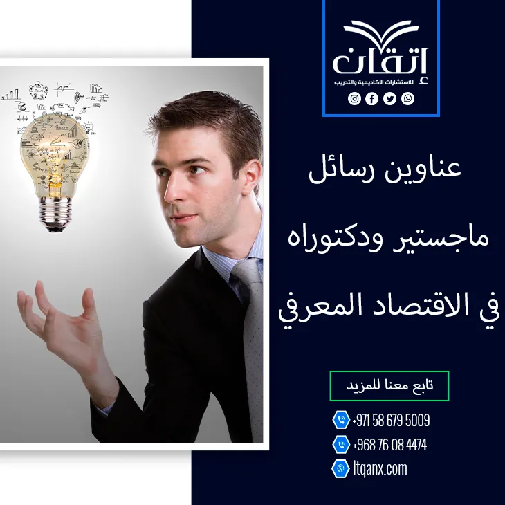وفي الختام يبقى الاقتصاد المعرفي محورًا تتسع حوله آفاق التطوير والابتكار؛ ليمنح الباحثين ساحة واسعة لصناعة الأثر العلمي، وتواصل شركة إتقان للاستشارات الأكاديمية والتدريب دورها كـشريك حقيقي للتميز، عبر توفير أحدث عناوين رسائل ماجستير ودكتوراه في الاقتصاد المعرفي ضمن خدماتها الأكاديمية المتخصصة، وإن كنت تطمح إلى دعم احترافي يعزز جودة بحثك ويقودك بثقة نحو النجاح، فإتقان هي الخيار الأمثل دون تردد، ويمكنك التواصل عبر تطبيق الواتساب بسهولة للحصول على استشارات دقيقة وخدمة تبنى خصيصًا لاحتياجاتك، ومع إتقان أنت لا تخط بحثًا فحسب بل تبني مستقبلك العلمي بذكاء.
