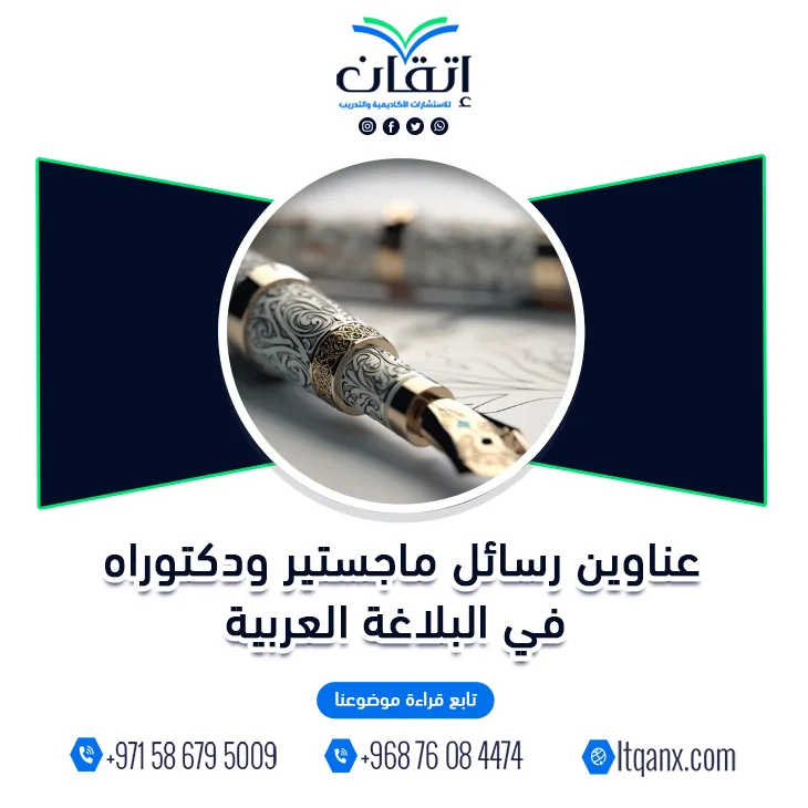 حينما يتأمل الباحث عالم البلاغة العربية يكتشف أنه لا يكتشف علماً فقط بل يفتح بوابة ساحرة تقوده إلى قلب اللغة وجمال التعبير وروعة البيان، وفي عالم البحث العلمي اليوم ازداد الطلب على عناوين رسائل ماجستير ودكتوراه في البلاغة العربية لما تحمله من عمق معرفي وقدرة على إبراز الإبداع اللغوي في أرقى صوره، ومن هذا الإدراك الواعي لاحتياجات الباحثين حرصت شركة إتقان للاستشارات الأكاديمية والتدريب على تقديم قيمة حقيقية لهم؛ وذلك بفضل فريقها المتميز الذي يجمع بين الجودة، والخبرة، والكفاءة الإبداعية، وانطلاقًا من معرفتها بأهمية هذا المجال وندرة العناوين القوية فيه قامت إتقان بإعداد باقة حصرية تضم أحدث وأهم عناوين رسائل ماجستير ودكتوراه؛ لدعم الباحثين ودفعهم نحو التميز العلمي والابتكار البحثي.