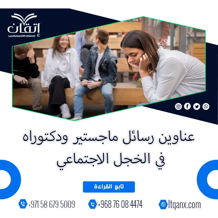 في عالمٍ تتسارع فيه وتيرة التواصل الاجتماعي يبرز الخجل الاجتماعي كظاهرة إنسانية معقدة تمس أعماق الشخصية وتؤثر في جودة العلاقات والتفاعل مع الآخرين، ولأن هذا الموضوع أصبح محور اهتمام متزايد بين الباحثين والدارسين في ميادين علم النفس والتربية حرصت شركة إتقان للاستشارات الأكاديمية والتدريب المعروفة بجودة خدماتها وكفاءتها الإبداعية بفضل فريقها المتميز على أن تضع بين يدي الباحثين باقة حصرية من عناوين رسائل ماجستير ودكتوراه في الخجل الاجتماعي، وهذه القائمة تمثل دليلاً علميًا ثريًا يدعم الباحثين في اختيار موضوعاتهم ويساعدهم على توجيه دراساتهم نحو الإبداع والتميز في هذا الميدان الإنساني العميق.