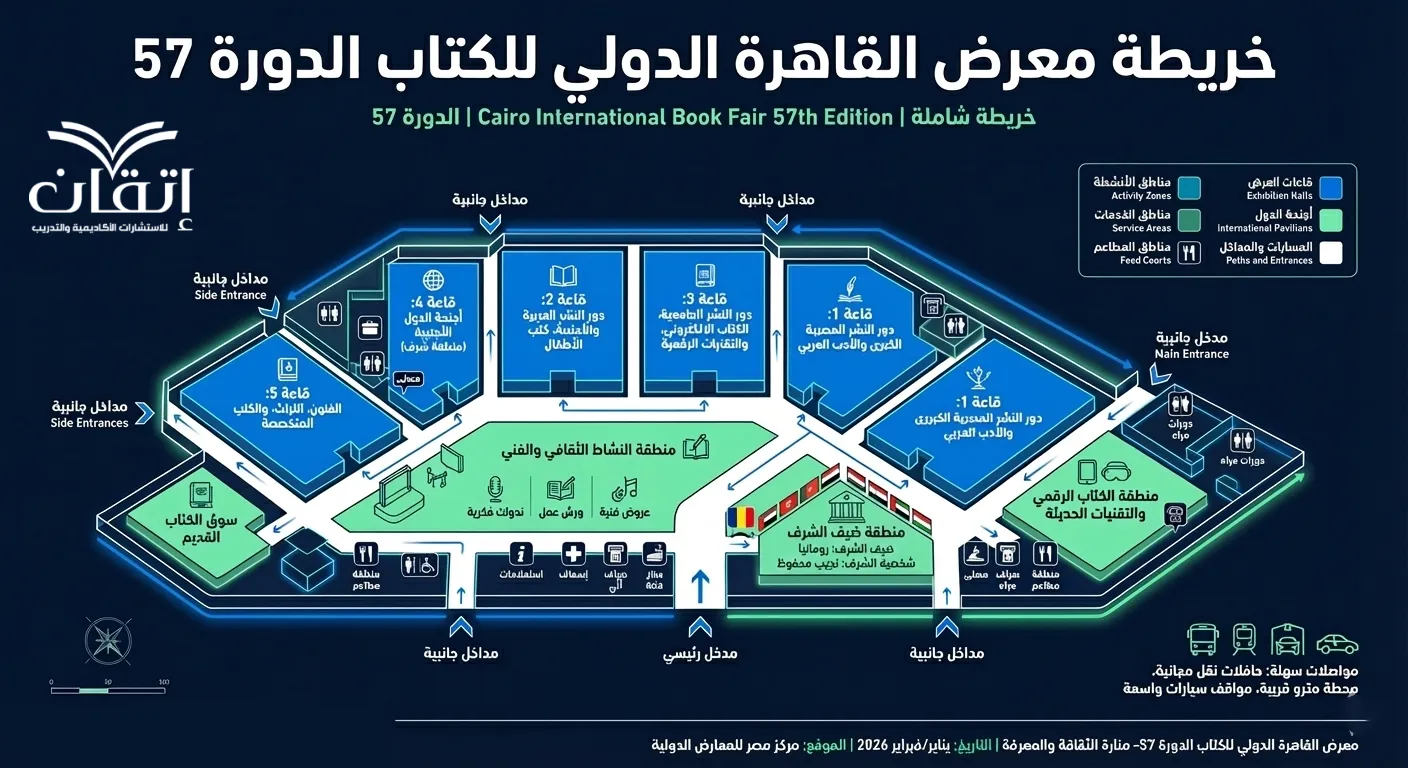 معرض القاهرة للكتاب 2026 يعد من أبرز الفعاليات الثقافية التي ينتظرها آلاف الزوار سنويًا؛ ولجعل تجربة الزوار أكثر سلاسة وتنظيمًا، تم تصميم خريطة المعرض بشكل مبتكر يُسهل التنقل بين الأقسام المختلفة ويساعد في الوصول إلى الأماكن المهمة بسرعة، سواء كنت زائرًا لأول مرة أو محترفًا في زيارة المعرض، فإن الخريطة ستكون دليلك الأمثل للاستمتاع بكل لحظة داخل المعرض وفيما توضيح دقيق للمعرض: