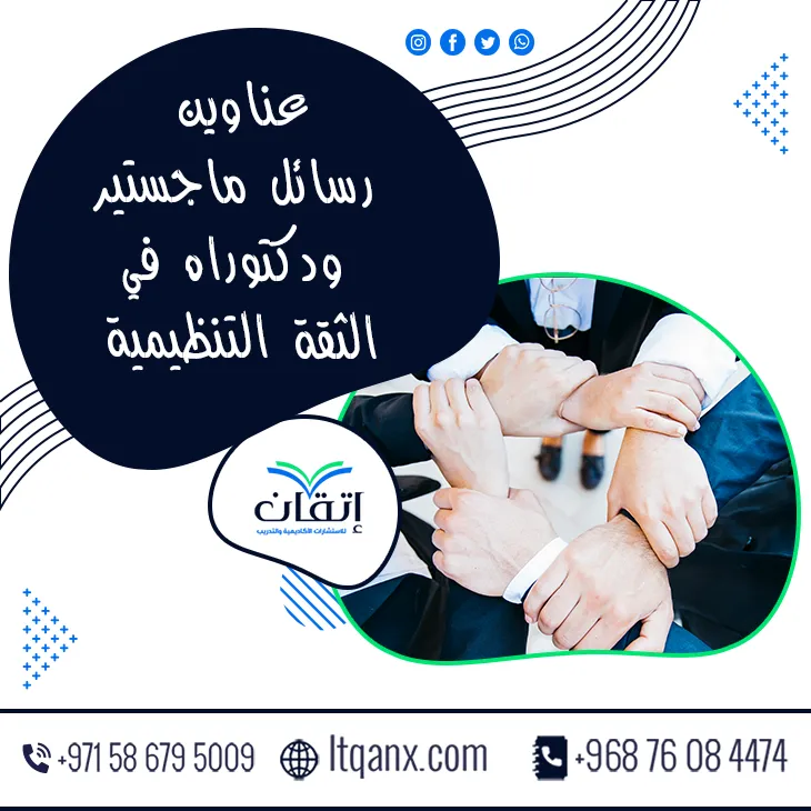 وفي النهاية يبقى موضوع الثقة التنظيمية بوابة مهمة لكل باحث يسعى لفهم جوهر العلاقات داخل المؤسسات، ويأتي الاعتماد على عناوين رسائل ماجستير ودكتوراه في الثقة التنظيمية كخطوة ذكية نحو إعداد بحوث ذات قيمة عالية، وتستمر شركة إتقان للاستشارات الأكاديمية والتدريب في أداء دورها كشريك نجاح حقيقي يرافق الباحث من الفكرة حتى الإنجاز؛ وذلك عن طريق فريق يتميز بالخبرة وجودة تستحق الاعتماد، وللحصول على دعم أكاديمي احترافي وسلس يمكنكم التواصل مباشرة عبر الواتساب بكل سهولة؛ لكي تبدأوا رحلتكم البحثية بثقة، ومع إتقان تصبح المعرفة طريقًا مفتوحًا نحو التميز.