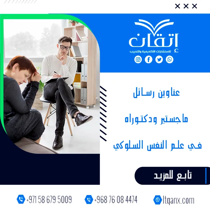في زمن تتسارع فيه التغيرات السلوكية يقدم علم النفس السلوكي مفتاحًا لفهم الإنسان وتفسير دوافعه، ولأن الباحثين يسعون دومًا لاختيار أفضل عناوين رسائل ماجستير ودكتوراه في علم النفس السلوكي تبرز شركة إتقان للاستشارات الأكاديمية والتدريب بخبرتها وجودتها وكفاءتها الإبداعية مقدمة باقة حصرية من أحدث العناوين البحثية لدعم الباحثين وتشجيعهم نحو التميز.