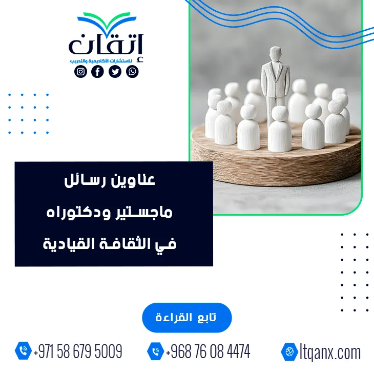 لم تعد الثقافة القيادية مجرد إطار نظري بل أصبحت عنصرًا حاسمًا في تشكيل أنماط القيادة وبناء بيئات عمل قادرة على التأثير والاستدامة، وقد انعكس ذلك في تزايد اهتمام الباحثين باختيار عناوين رسائل ماجستير ودكتوراه في الثقافة القيادية بوصفها مدخلًا علميًا لفهم القيم والممارسات القيادية داخل المؤسسات، وانطلاقًا من وعيها بأهمية هذا المجال البحثي تتميز شركة إتقان للاستشارات الأكاديمية والتدريب بجودة خدماتها وكفاءتها الإبداعية، اعتمادًا على فريق عمل متميز وذو خبرة أكاديمية؛ ولذلك حرصت إتقان على تقديم باقة منتقاة من أحدث وأهم العناوين البحثية لدعم الباحثين في هذا المجال الحيوي.