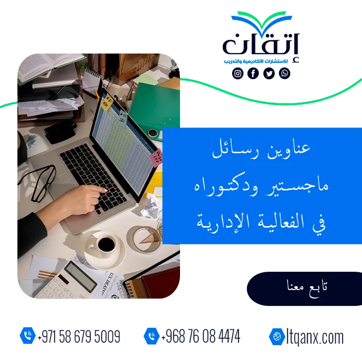لم تعد الفعالية الإدارية مجرد إطار نظري بل أصبحت معيارًا حاسمًا لنجاح المؤسسات وقدرتها على تحقيق أهدافها بكفاءة واستدامة في بيئات عمل متغيرة، وقد أسهم هذا التحول في ازدياد الطلب على عناوين رسائل ماجستير ودكتوراه في الفعالية الإدارية بوصفها مدخلًا علميًا لتحليل جودة الأداء والقرارات الإدارية، وانطلاقًا من إدراكها العميق لأهمية هذا المجال لدى الباحثين تتميز شركة إتقان للاستشارات الأكاديمية والتدريب بجودة خدماتها وكفاءتها الإبداعية، مستندةً إلى فريق عمل متميز وذو خبرة بحثية راسخة، ولهذا قدمت إتقان باقة متكاملة من أحدث وأهم العناوين البحثية لدعم الباحثين وتمكينهم من بناء دراسات رصينة.