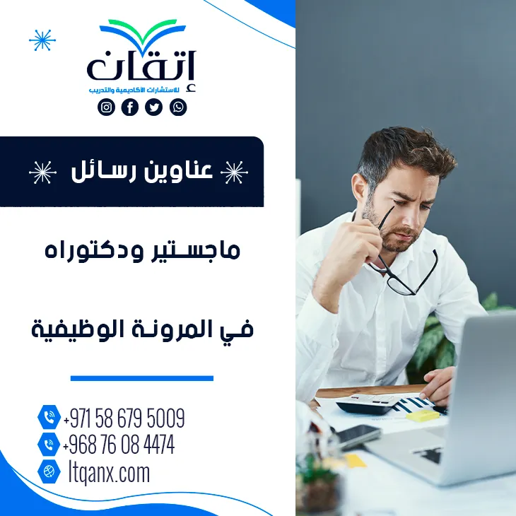 وختامًا، تظل المرونة الوظيفية ركيزة أساسية لفهم مستقبل العمل وتطوير الأداء المؤسسي في ظل المتغيرات المتسارعة، ويعكس تنوع وعمق عناوين رسائل ماجستير ودكتوراه في المرونة الوظيفية الاهتمام الأكاديمي المتنامي بهذا المفهوم ودوره في تعزيز الكفاءة والاستدامة التنظيمية، ومن هنا، تبرز شركة إتقان بوصفها شريك النجاح والتميز الأكاديمي، بما تقدمه من دعم علمي احترافي للباحثين في مختلف المراحل، وللحصول على الإرشاد الأكاديمي والمساندة البحثية بكل سهولة، يمكنكم التواصل مباشرة عبر تطبيق الواتساب، حيث يبدأ طريق التميز بخطوة واثقة ومدروسة.
