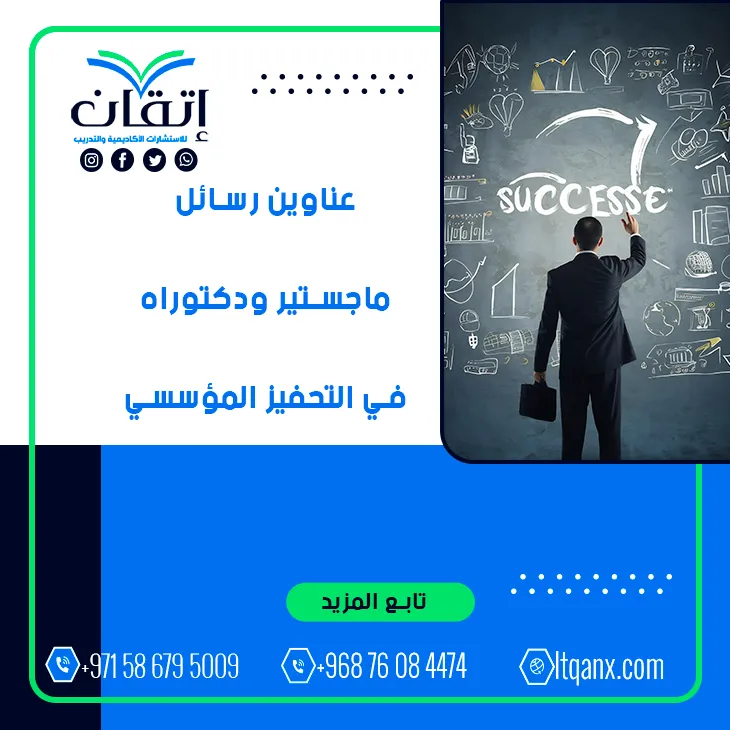 وفي الختام تواصل شركة إتقان دورها كشريك النجاح والتميز الأكاديمي من خلال توفير أحدث عناوين رسائل ماجستير ودكتوراه في التحفيز المؤسسي، بما يُعزز فرص الباحثين في إنجاز أعمال علمية رصينة ومؤثرة، ويمكنكم التواصل مع فريق إتقان عبر تطبيق الواتساب بكل سهولة للحصول على دعم أكاديمي احترافي يقودكم بثقة نحو التفوق والريادة البحثية.