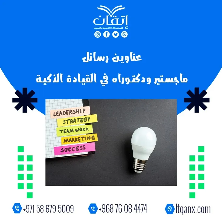 وفي الختام تؤكد شركة إتقان للاستشارات الأكاديمية والتدريب مكانتها كشريك النجاح والتميز الأكاديمي؛ وذلك من خلال توفير أحدث عناوين رسائل ماجستير ودكتوراه في القيادة الذكية، بما يواكب متطلبات البحث العلمي المعاصر، ويدعوكم فريق إتقان للتواصل بكل سهولة عبر تطبيق واتساب للحصول على الدعم الأكاديمي المتكامل، بما يضمن رحلة بحثية أكثر احترافية وتميزًا.