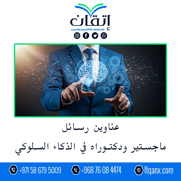 في عصر تزايد فيه الاهتمام بفهم السلوك البشري وإدارته بذكاء أصبح الذكاء السلوكي محورًا أساسيًا للبحث والدراسة، وتدرك شركة إتقان للاستشارات الأكاديمية والتدريب أهمية هذا المجال لدى الباحثين؛ ولذلك قدمت باقة من أهم وأحدث عناوين رسائل ماجستير ودكتوراه في الذكاء السلوكي لدعم الباحثين بجودة وكفاءة إبداعية عالية.