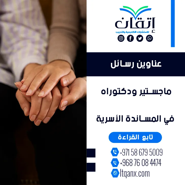 وفي الختام تظل المساندة الأسرية حجر الأساس في بناء شخصية متوازنة وقادرة على مواجهة تحديات الحياة، وهو ما تعكسه بوضوح عناوين رسائل ماجستير ودكتوراه في المساندة الأسرية المتجددة، وتؤكد شركة إتقان للاستشارات الأكاديمية والتدريب مكانتها كشريك للنجاح والتميز الأكاديمي عبر دعمها المستمر والمبتكر للباحثين، فقط قم بالتواصل بسهولة عبر تطبيق الواتساب للحصول على الدعم الأكاديمي الذي يصنع الفارق في رحلتك البحثية.