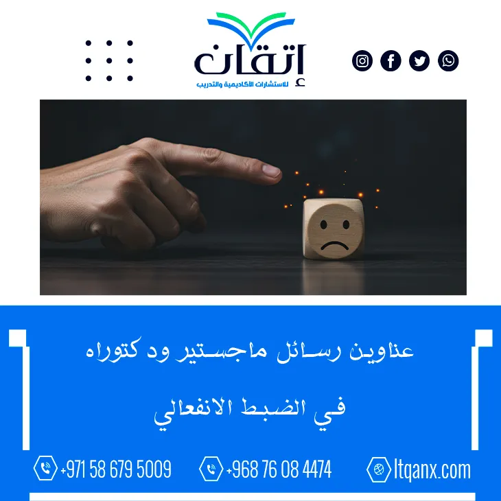 في لحظة انفعال واحدة قد تتشكل قرارات مصيرية، وهنا يبرز الضبط الانفعالي كمهارة خفية تضبط إيقاع السلوك وتعيد التوازن إلى العقل، ومع تنامي الاهتمام الأكاديمي بهذا المجال أصبحت عناوين رسائل ماجستير ودكتوراه في الضبط الانفعالي محورًا غنيًا للدراسات النفسية والتربوية المعاصرة، ومن هذا المنطلق تتميز شركة إتقان للاستشارات الأكاديمية والتدريب بجودتها وكفاءتها الإبداعية، مستندةً إلى فريق عمل خبير يدرك أهمية هذا الموضوع؛ مما دفعها لتقديم باقة حديثة من أبرز العناوين البحثية لدعم الباحثين نحو التميز.