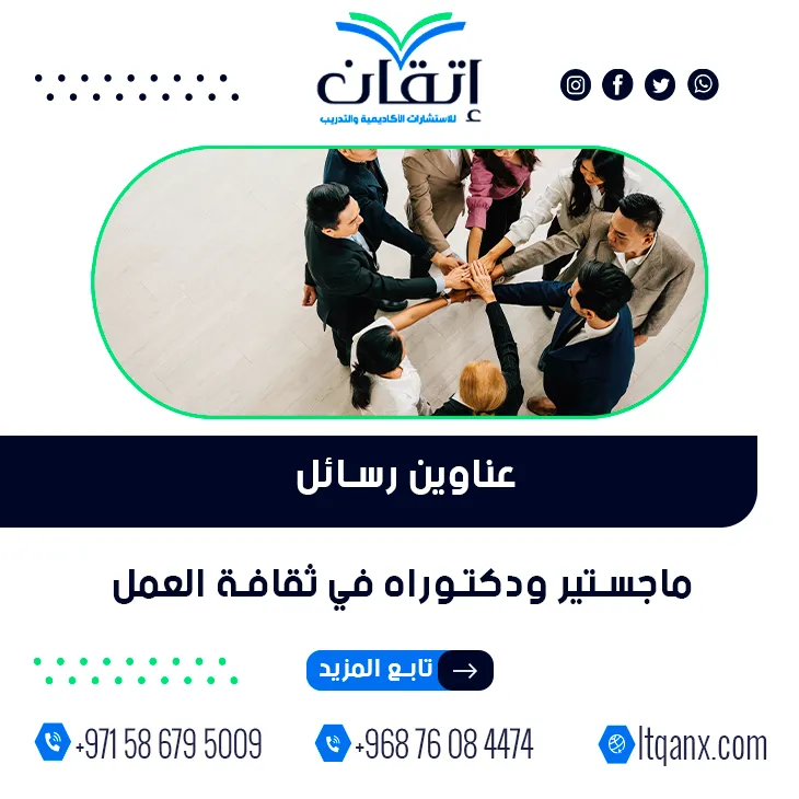 وفي الختام تؤكد شركة إتقان مكانتها كشريك النجاح والتميز الأكاديمي، من خلال تقديم عناوين رسائل ماجستير ودكتوراه في ثقافة العمل بصورة احترافية تلبي احتياجات الباحثين، مع إتاحة التواصل بسهولة عبر الواتساب للحصول على دعم أكاديمي متكامل يسهم في تحقيق الإنجاز والتميز.