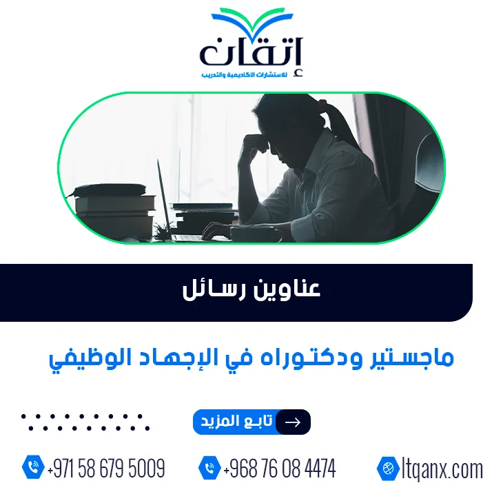 في سباقٍ لا يتوقف داخل بيئات العمل الحديثة يتحول الجهد إلى ضغط، والإنجاز إلى عبءٍ خفي يُعرف بالإجهاد الوظيفي؛ مما يدفع الباحثين للتعمق فيه عبر عناوين رسائل ماجستير ودكتوراه في الإجهاد الوظيفي التي تكشف أبعاده النفسية والتنظيمية، وانطلاقًا من هذا الاهتمام المتزايد تبرز شركة إتقان للاستشارات الأكاديمية والتدريب بجودة خدماتها وكفاءتها الإبداعية، اعتمادًا على فريق عمل خبير، وإدراكًا منها لأهمية الموضوع قدمت باقة متميزة من أحدث العناوين البحثية لدعم الباحثين وتعزيز إنتاجهم العلمي.