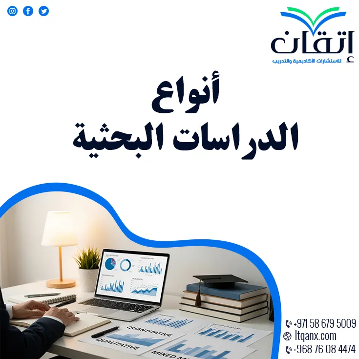 وفي الختام يعد معرفة أنواع الدراسات البحثية واختيار النوع الأنسب لبحثك العلمي هو الخطوة الأولى نحو إعداد دراسة متكاملة وموثوقة، وشركة إتقان للاستشارات الأكاديمية تقف إلى جانبك في كل خطوة، لتضمن أن بحثك يعكس أعلى مستوى من الاحترافية والدقة الأكاديمية، للتواصل والحصول على خدماتنا في السعودية، الكويت، قطر، الإمارات، وجميع الدول العربية، يمكنك التواصل معنا عبر الواتساب والبدء في إعداد خطة بحث علمية معتمدة تعكس مستوى بحثك الأكاديمي بأعلى احترافية.