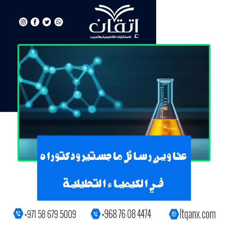 تُعتبر الكيمياء التحليلية حجر الزاوية في فهم تركيب المواد ودراسة خصائصها؛ مما يجعل البحث العلمي فيها من أهم المجالات الدقيقة والمتطورة، ومن هذا المنطلق قدمت شركة إتقان للاستشارات الأكاديمية والتدريب قائمة غنية بـ عناوين رسائل ماجستير ودكتوراه في الكيمياء التحليلية، مدعومةً بخبرة فريق عمل متميز يضمن الجودة والإبداع الأكاديمي؛ وذلك لدعم الباحثين في رحلتهم العلمية.