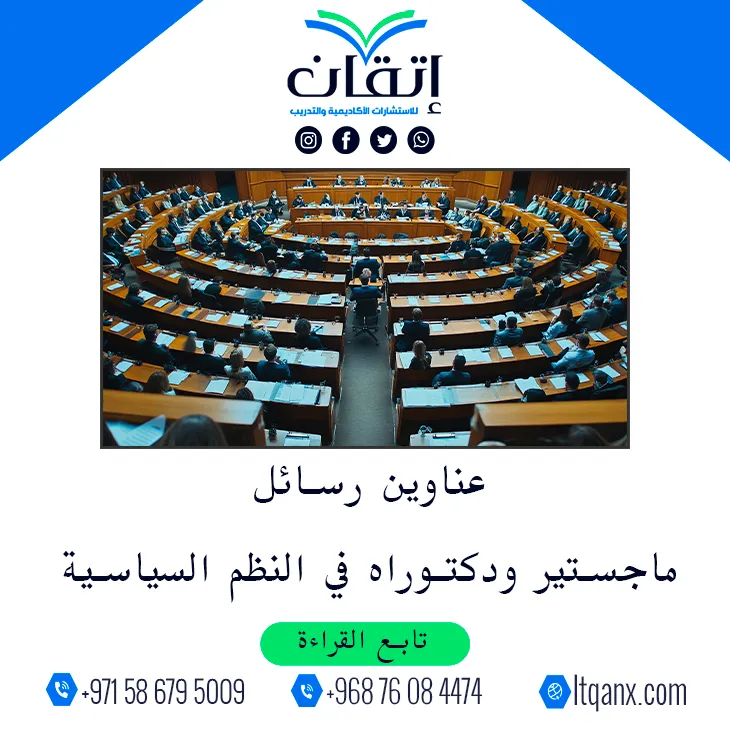 وفي الختام تؤكد شركة إتقان أنها شريك النجاح والتميز الأكاديمي لكل باحث يسعى للتفوق عبر عناوين رسائل ماجستير ودكتوراه في النظم السياسية المصممة وفق أحدث المعايير العلمية، وللحصول على دعم أكاديمي متكامل وخدمات بحثية موثوقة يمكنكم التواصل بسهولة عبر تطبيق الواتساب والاستفادة من خبرات متخصصة ترتقي بمسيرتكم البحثية.