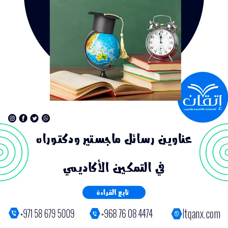 وفي الختام تمثل عناوين رسائل ماجستير ودكتوراه في التمكين الأكاديمي خطوة محورية نحو بناء كفاءات علمية قادرة على المنافسة والتميز، وهنا تتألق شركة إتقان كشريك النجاح والتميز الأكاديمي لكل باحث طموح، فقط قم بالتواصل الآن عبر تطبيق الواتساب بكل سهولة لتحصل على دعم أكاديمي احترافي يضعك على طريق الإنجاز بثقة وتميز.