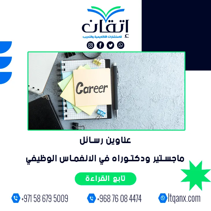 وفي نهاية الحديث يظل الانغماس الوظيفي أحد المفاتيح الجوهرية لتعزيز الأداء المؤسسي، وهو ما تعكسه أهمية عناوين رسائل ماجستير ودكتوراه في الانغماس الوظيفي في توجيه البحوث المعاصرة، وتبقى شركة إتقان شريك النجاح والتميز الأكاديمي لكل باحث طموح، بما تقدمه من دعم احترافي وخبرة موثوقة؛ لذلك لا تتردد في التواصل عبر الواتساب بكل سهولة للحصول على استشارات أكاديمية متكاملة تقودك نحو التميز بثقة.