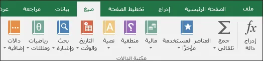 الدالات هي صيغ معرّفة مسبقاً من خلالها يتم عمل العمليات الحسابية باستخدام قيم معيّنة، تسمى الوسيطات، يمكن استخدام الدالات لإجراء عمليات حسابية بسيطة أو معقدة، يمكن إيجاد جميع دالات Excel في علامة التبويب "الصيغ" الموجودة على "الشريط":