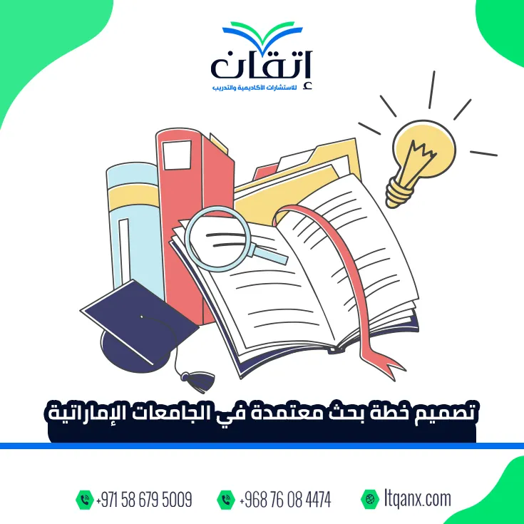 تقوم شركة إتقان بتصميم خطط بحث علمية متكاملة تتوافق مع متطلبات الجامعات الإماراتية مع مراعاة الدقة الأكاديمية وترابط جميع عناصر البحث بشكل منهجي.