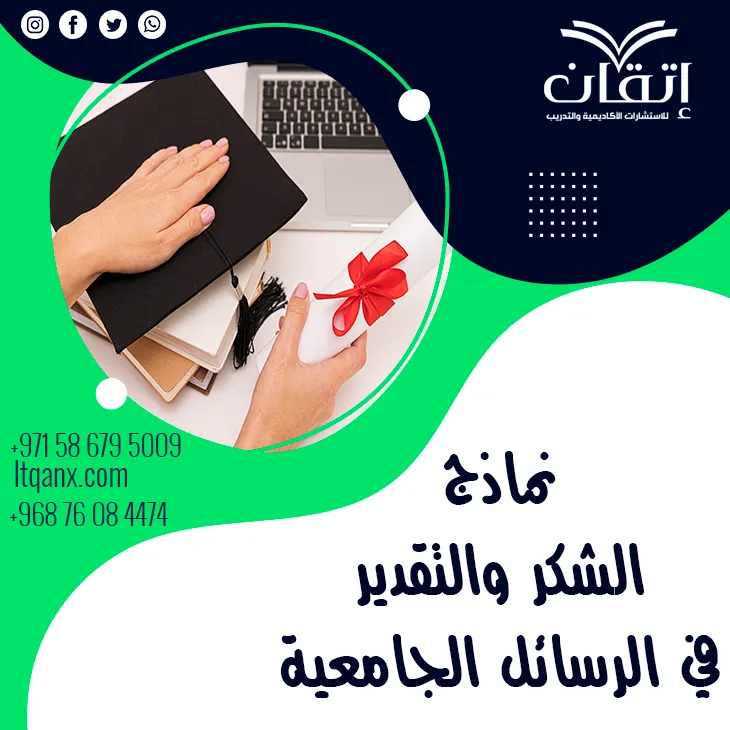 في ختام نماذج الشكر والتقدير في الرسائل الجامعية تُعد شركة إتقان للاستشارات الأكاديمية والتدريب من الشركات الرائدة التي تضع نصب أعينها رفع مستوى البحث العلمي والتطوير الأكاديمي، من خلال تقديم خدمات متكاملة تشمل إعداد المقترحات البحثية، وخطط البحث، والتدريب على مهارات البحث والكتابة، تساهم الشركة في بناء جيل من الباحثين المؤهلين القادرين على المنافسة محليًا ودوليًا، إن احترافية فريق إتقان وخبرته العميقة في مجالات الاستشارات الأكاديمية، بالإضافة إلى الاهتمام بالتفاصيل الدقيقة، يجعلها شريكًا موثوقًا لكل طالب وباحث يسعى لإثراء مسيرته العلمية، باختيار إتقان، تضمن دعمًا مستمرًا يضمن تحقيق أهدافك الأكاديمية بكفاءة واحتراف، نقدم لك خدمات البحث العلمي، كل ما التواصل معنا عبر الواتساب.