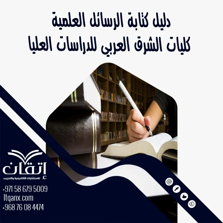 نحن في شركة إتقان نقدم لك دليل الرسائل العلمية لكليات الشرق العربي للدراسات العليا بشكل مجاني كجزء من رسالتنا لخدمة الباحثين، وهذا الدليل العلمي بمثابة مرجع رسمي موثوق يمكنك الاعتماد عليه في كل خطوة من خطوات إعداد رسالتك للماجستير أو الدكتوراه، ويوفر الدليل وصفة متكاملة لتنظيم البحث، وصياغة الأفكار، وتوثيق المراجع، والالتزام بالمعايير الأكاديمية، ليكون رفيقك الأساسي في رحلة البحث العلمي، ويضمن لك إنجاز رسالة علمية متميزة وموثوقة.