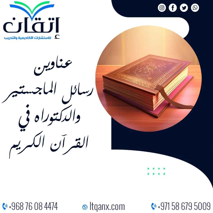 يُعد القرآن الكريم منبع الهداية ومصدر القيم التي تقوم عليها مناهج التربية الإسلامية، وقد أولته الدراسات الأكاديمية مكانة بارزة لما يحمله من مضامين تربوية ومعرفية عميقة، ومن هنا برزت أهمية عناوين رسائل ماجستير ودكتوراه في القرآن الكريم كمدخل لفهم أوسع وتطبيق أعمق، ولأننا نعرف قيمة وأهمية هذه الدراسات ؛ لذلك أولت لها شركة إتقان للاستشارات الاكاديمية والتدريب اهتمامًا خاصًا؛ حيث إنها قدمت قائمة متميزة من عناوين رسائل ماجستير ودكتوراه في موضوع القرآن الكريم تراعي الحداثة والابتكار؛ لكي تكون دليلًا عمليًا للباحثين وطلاب الدراسات العليا في رحلتهم نحو التميز العلمي.