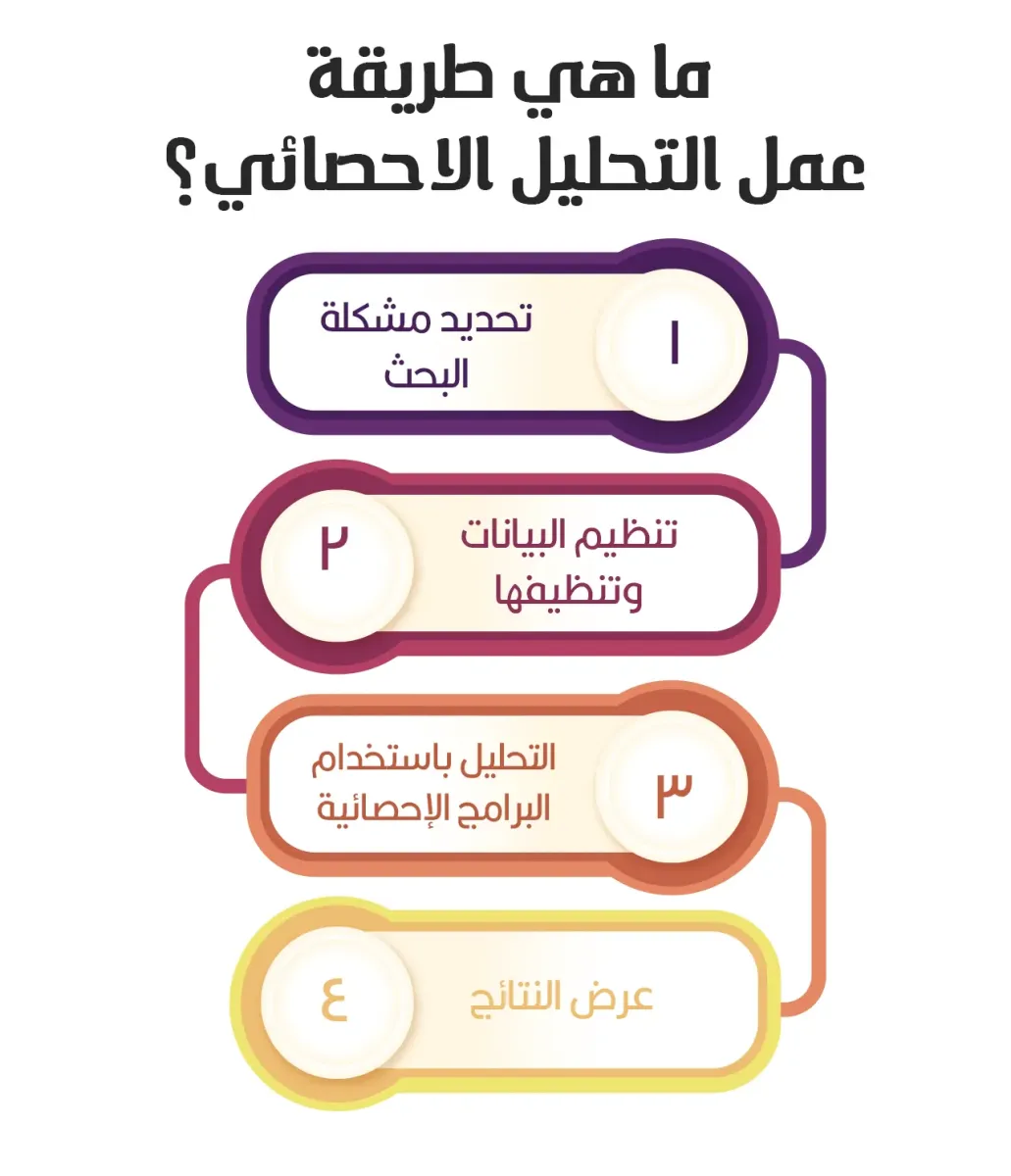 تتمثل طريقة عمل التحليل الإحصائي في مجموعة من الخطوات المتتابعة التي تهدف إلى فهم البيانات وتحويلها إلى معلومات ذات قيمة علمية أو عملية، وهي: