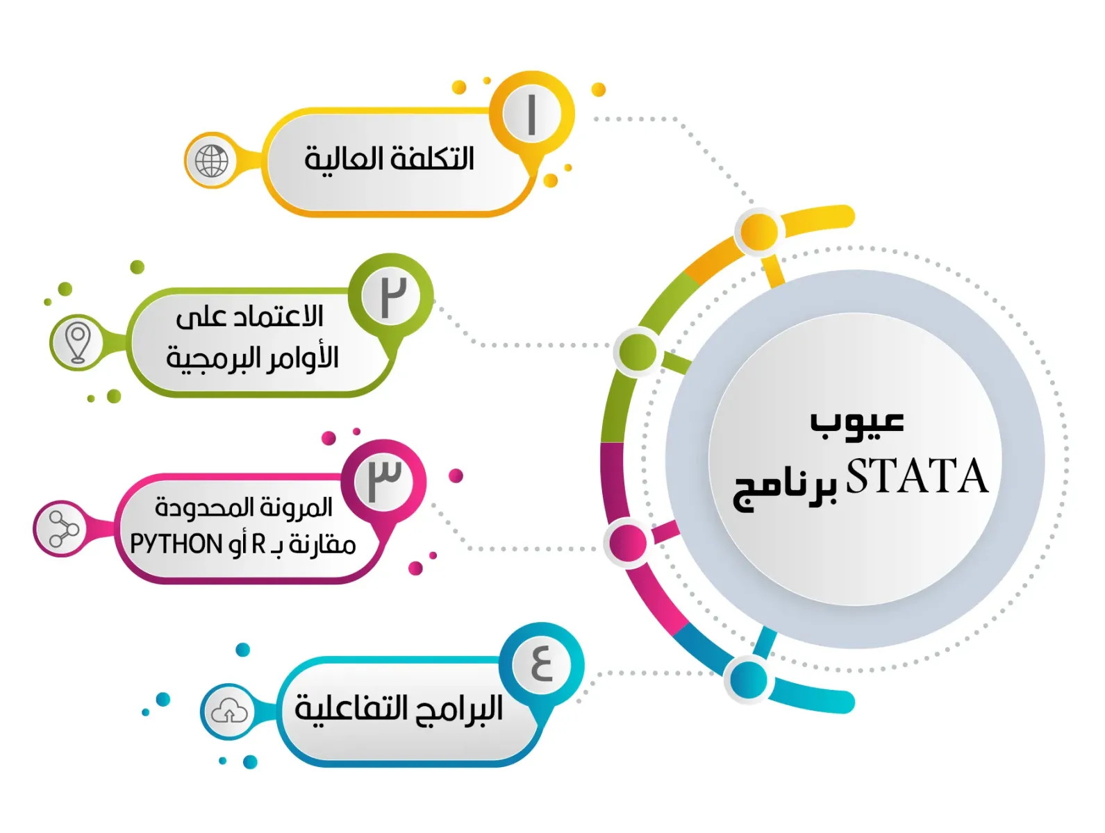 على الرغم من المزايا العديدة التي يقدمها برنامج Stata في مجال التحليل الإحصائي، إلا أنه لا يخلو من بعض القيود التي قد تؤثر على تجربته للمستخدمين، وتشمل هذه القيود جوانب، مثل: التكلفة، ومتطلبات الخبرة البرمجية، وبعض القيود في التعامل مع البيانات الضخمة أو التحليلات المتقدمة؛ لذا من المهم التعرف على هذه العيوب لفهم متى يكون استخدام Stata مناسبًا، وإليك عيوب برنامج Stata الإحصائي: