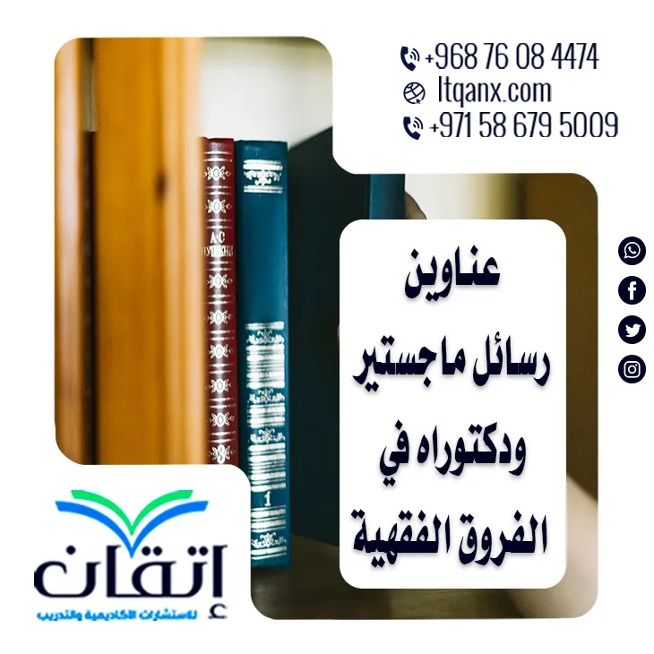 وفي النهاية بعد استعراض أهم عناوين رسائل الماجستير والدكتوراه الحديثة لعام 2023-2024 في الفروق الفقهية، نسأل الله العلى الكريم أن يوفق جميع الباحثين في مسيرتهم العلمية، وإذا رغبت في أي وقت بالحصول على عناوين مميزة لرسالتك البحثية، يمكنك الاعتماد على شركة "إتقان" للاستشارات الأكاديمية والتدريب؛ حيث يوفر فريقنا المختص خبرات متميزة في هذا المجال، تواصل معنا بسهولة عبر الواتساب لتلقي الدعم المناسب.