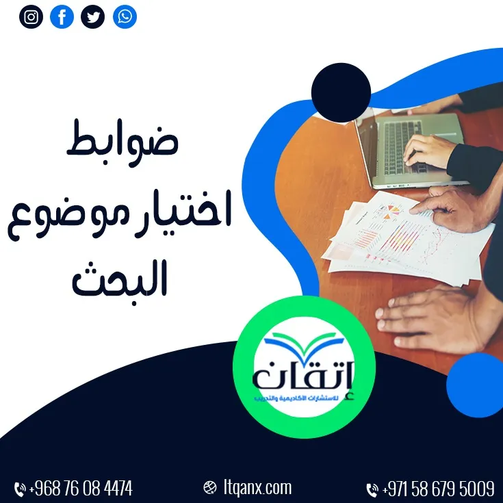 في الختام يتضح أن ضوابط اختيار موضوع البحث هي حجر الزاوية في للدراسة أكاديمية ناجحة، وتؤثر بشكل مباشر على (صياغة الأسئلة، تحديد الأهداف، اختيار المنهجية المناسبة، الالتزام بالضوابط العلمية، استخدام الاستراتيجيات المنهجية، الاطلاع على الأدبيات السابقة، تقييم الجدوى، واستشارة الخبراء)، كما أن شركة إتقان للاستشارات الأكاديمية والتدريب توفر لك جميع خدمات البحث العلمي ويمكن التواصل عبر الواتساب.