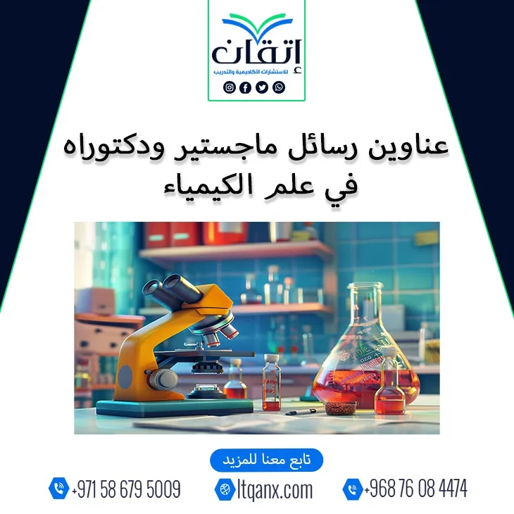 في عالمٍ تتقاطع فيه الأسرار الذرية مع روعة الاكتشافات العلمية يظل علم الكيمياء بوابة الإنسان لفهم جوهر الكون وتحويل المعرفة إلى ابتكارٍ ملموس يغير وجه الحياة، ومن هذا الإدراك العميق لأهمية هذا الحقل الحيوي تبرز شركة إتقان للاستشارات الأكاديمية والتدريب كمنارة للتميز الأكاديمي، وتمتلك إتقان فريقًا مبدعًا يجمع بين الخبرة البحثية والدقة المنهجية والروح الابتكارية، وانطلاقًا من التزامها بدعم الباحثين الطموحين تقدم الشركة مجموعة استثنائية من عناوين رسائل ماجستير ودكتوراه في علم الكيمياء صممت بعناية؛ لكي تواكب أحدث الاتجاهات العلمية، وتفتح أمام الباحثين آفاقًا جديدة للإبداع والاكتشاف في هذا العلم المتجدد.