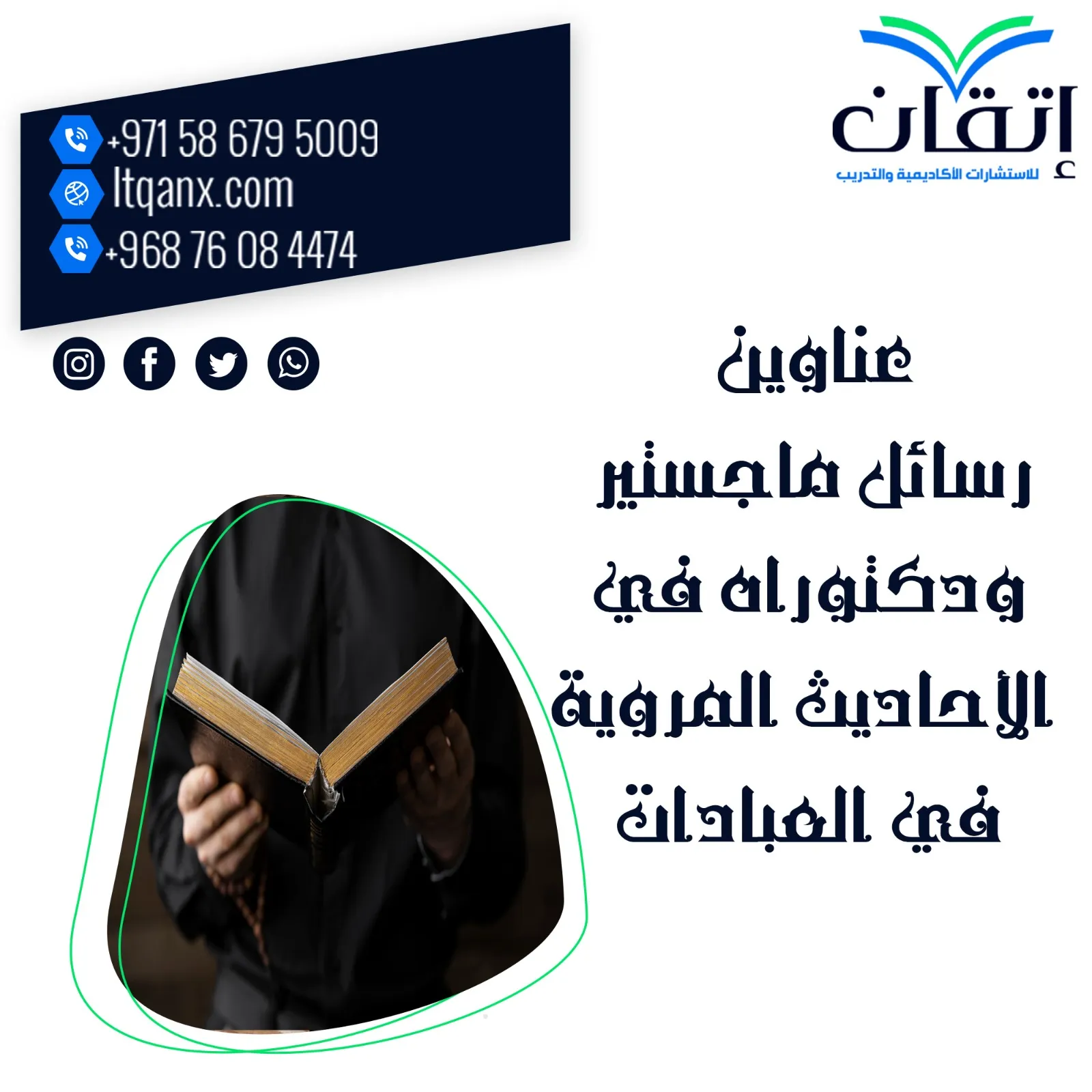 في ختام الحديث بعد أن قدمنا لكم حصريا أبرز عناوين رسائل ماجستير ودكتوراه في الأحاديث المروية في العبادات، نسأل الله تعالى أن يوفق جميع الباحثين في مسيرتهم العلمية، وإن رغبت في أي وقت بالحصول على عناوين رسائل ماجستير ودكتوراه في مجال الفقه الإسلامي، كل ما عليك هو الاعتماد على شركة "إتقان" للاستشارات الأكاديمية والتدريبية؛ حيث يضم فريقنا نخبة من المتخصصين في هذا المجال، لا تتردد في التواصل معنا عبر تطبيق الواتساب.