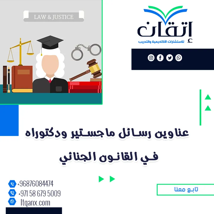 وفي ختام الحديث يظل القانون الجنائي مجالًا غنيًا بالتحديات والفرص البحثية التي تمكن الباحث من تطوير أفكار مبتكرة وتسليط الضوء على القضايا القانونية الحيوية، وتبقى شركة إتقان شريك النجاح والتميز الأكاديمي مقدمة أحدث عناوين رسائل ماجستير ودكتوراه في القانون الجنائي؛ لضمان انطلاقة بحثية واثقة لكل باحث طموح، ويمكنكم التواصل بكل سهولة عبر تطبيق الواتساب للحصول على الدعم الأكاديمي المتكامل، والانطلاق نحو بحث مميز يعكس طموحكم وتميزكم العلمي.