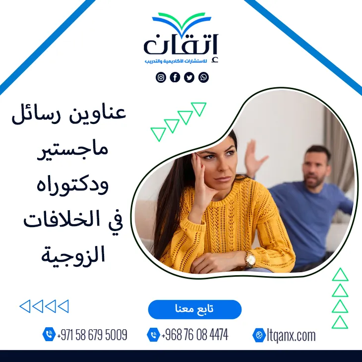 إن الخلافات الزوجية لم تعد مجرد ظاهرة اجتماعية عابرة بل أصبحت قضية بحثية عميقة تمس استقرار الأسرة وبناء المجتمع، وقد ازداد اهتمام الباحثين بدراسة أبعادها النفسية والاجتماعية والتربوية؛ مما انعكس في تنوع عناوين رسائل ماجستير ودكتوراه في الخلافات الزوجية، ومن هذا المنطلق تدرك شركة إتقان للاستشارات الأكاديمية والتدريب أهمية هذا الموضوع وحساسيته في الأبحاث العلمية، وتتميز إتقان بالجودة والكفاءة الإبداعية بفضل فريق عمل خبير؛ مما دفعها لتقديم باقة من أحدث وأهم العناوين البحثية دعمًا للباحثين.