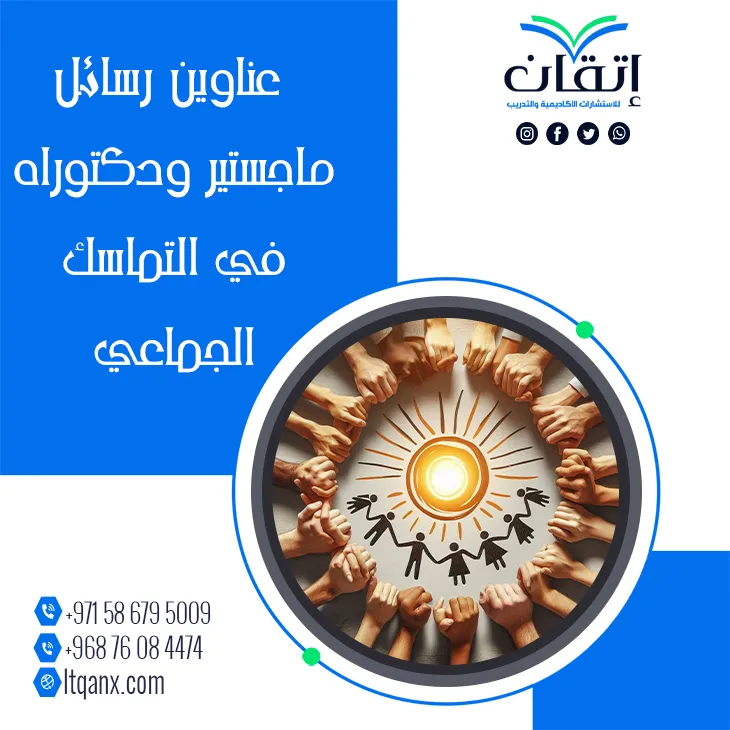 في عالم تتسارع فيه التغيرات يبرز التمـاسك الجماعي بوصفه حجر الأساس في بناء الفرق والمؤسسات القادرة على الإنجاز والاستدامة، لما له من دور محوري في تعزيز الانتماء والتكامل وتحقيق الأهداف المشتركة، وقد انعكس هذا الاهتمام المتزايد في تزايد البحث عن عناوين رسائل ماجستير ودكتوراه في التماسك الجماعي بوصفها مجالًا غنيًا بالتحليل والتطبيق العلمي، وانطلاقًا من وعيها العميق بقيمة هذا الموضوع لدى الباحثين تتميز شركة إتقان للاستشارات الأكاديمية والتدريب بالجودة والكفاءة الإبداعية، مستندةً إلى فريق عمل متميز وذو خبرة راسخة؛ لذلك حرصت الشركة على تقديم باقة منتقاة من أحدث وأهم العناوين البحثية في هذا المجال دعمًا لمسيرة الباحثين وتمكينًا لهم من التميز العلمي.