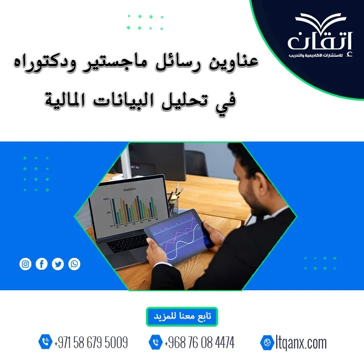 في عالم تتسارع فيه الأسواق المالية وتتقلب فيه الأسعار يصبح فهم الأرقام والبيانات بدقة هو مفتاح النجاح والتميز الأكاديمي والمهني، هنا يبرز تحليل البيانات المالية كأداة لا غنى عنها للباحثين لدراسة الأداء المالي، وتقييم الاستثمارات، وفهم العوامل المؤثرة على المؤسسات والشركات، ومن هذا المنطلق تقدم شركة إتقان للاستشارات الأكاديمية والتدريب تجربة فريدة للباحثين، بفضل فريقها المتميز وكفاءتها الإبداعية؛ حيث إنها توفر لهم عناوين رسائل ماجستير ودكتوراه في تحليل البيانات المالية ضمن قائمة حصرية من أحدث وأهم الموضوعات البحثية؛ لدعم الباحثين وتمكينهم من الانطلاق نحو دراسات متقنة ومؤثرة.