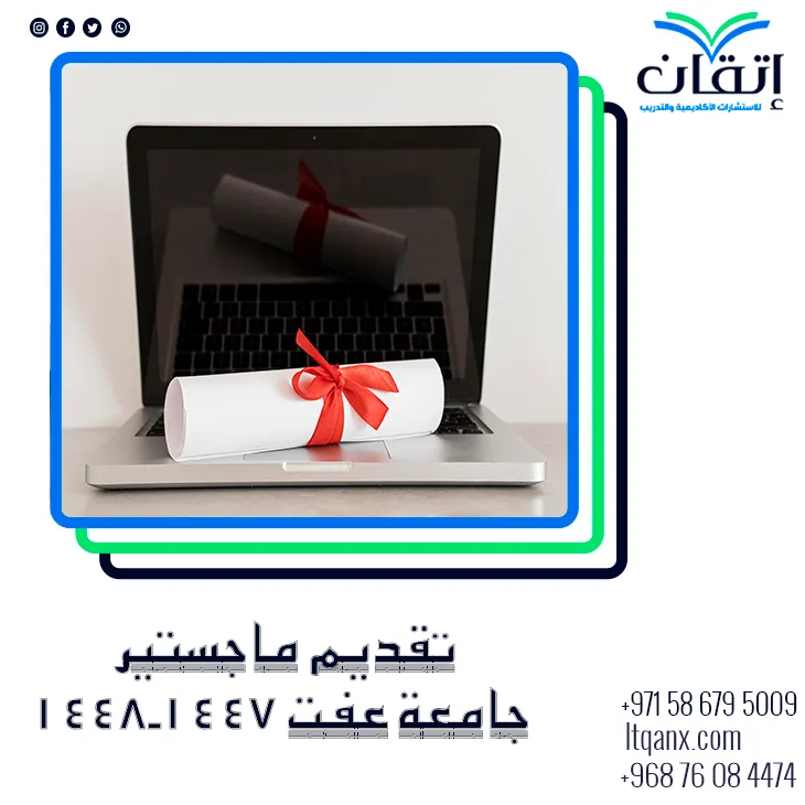 في اتقان للاستشارات الأكاديمية والتدريب نؤمن بأن نجاحك الأكاديمي والمهني يبدأ بخطوة صحيحة ومُخطط لها بعناية، نحن نقدم لك خبرات متكاملة في الإشراف الأكاديمي، التدريب المتخصص، والاستشارات التي ترتقي بمستوى عملك، اختر اتقان للاستشارات الأكاديمية والتدريب لتكون رحلتك الأكاديمية أكثر وضوحًا وثقة وتميزًا، ولتحقيق النجاح في تقديم ماجستير جامعة عفت 1447-1448هـ بكل سهولة ويسر، كل ما عليك التواصل معنا عبر الواتساب.