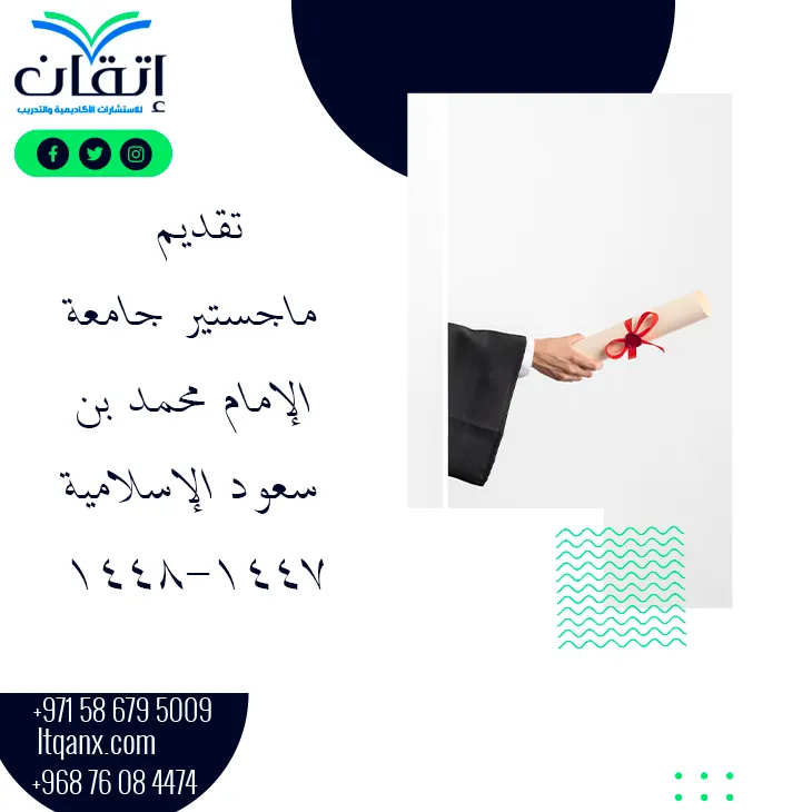 في إتقان للاستشارات الأكاديمية والتدريب، نضع بين يديك خبرتنا العملية والعلمية لمساعدتك على تحقيق أهدافك الأكاديمية والمهنية بكفاءة واحترافية، بما في ذلك تسهيل عملية تقديم ماجستير جامعة الإمام محمد بن سعود الإسلامية 1447-1448هـ نقدم حلولًا متكاملة تشمل الإرشاد الأكاديمي، إعداد البحوث، وتطوير المهارات، والتدريب المتخصص وفق أعلى المعايير الدولية، مع فريقنا المؤهل والمتفاني، اختر إتقان للاستشارات الأكاديمية والتدريب شريكك الأمثل لتضمن خطوات مدروسة، ناجحة، ومثمرة في رحلتك الأكاديمية والمهنية، فلا تتردد في التواصل على الواتساب الآن.