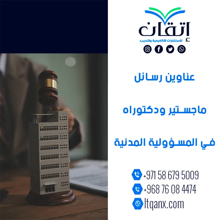 وفي ختام الحديث يظل الاطلاع على عناوين رسائل ماجستير ودكتوراه في المسؤولية المدنية خطوة مهمة لكل باحث يسعى إلى بناء دراسة قانونية رصينة ومؤثرة، ومن هذا المنطلق تؤكد شركة إتقان للاستشارات الأكاديمية والتدريب مكانتها كشريك للنجاح والتميز الأكاديمي من خلال تقديم الدعم والإرشاد المتخصص، ويسعد فريق إتقان استقبال استفساراتكم والتواصل معكم بسهولة عبر تطبيق الواتساب للحصول على المساندة الأكاديمية بكل احترافية.