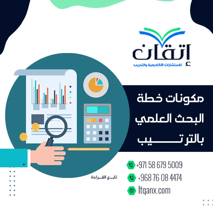 تقدم شركة اتقان للاستشارات الأكاديمية والتدريب خبرة واسعة وحلول مبتكرة لدعم الباحثين والطلاب في جميع مراحل دراستهم، بما في ذلك إعداد مكونات خطة البحث العلمي بالترتيب بشكل احترافي، من صياغة مقدمة بحث قصيرة إلى تقديم خدمات البحث العملي والدورات التدريبية في الدول العربية، مثل: المملكة العربية السعودية، وقطر، والكويت، والإمارات، ونقدم لك ترتيب وتنسيق الرسائل العلمية للماجستير والدكتوراه، اختر اتقان شريكك الأمثل لتحقيق التميز الأكاديمي وتطوير مهاراتك العلمية والمهنية مع إمكانية التواصل السريع عبر الواتساب للحصول على الدعم الفوري.