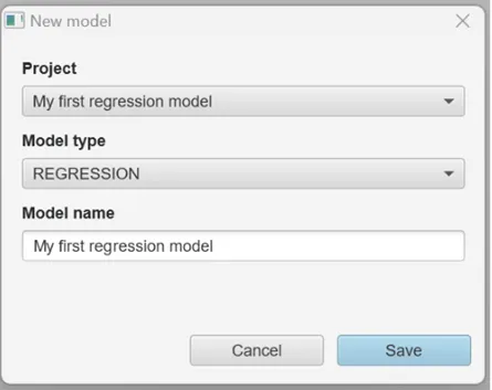 ✦ في مربع الحوار قم بتسمية النموذج مثلًا: نموذج الانحدار الأول، ثم الضغط على زر حفظ، سوف يتم فتح محرر النموذج، مما يتيح البدء في العمل على النموذج الجديد.