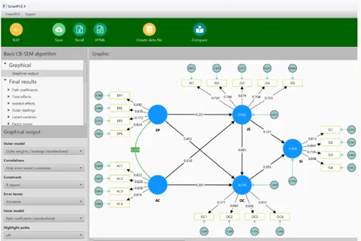 تتيح للمستخدم قائمة التنقل في التقارير على الجانب الأيسر لاستعراض نتائج الانحدار المختلفة، توفر هذه النتائج التي يقدمها برنامج SmartPLS تقييمًا شاملًا للنموذج، كما هو موضح على سبيل المثال في الكتب الدراسية Hair et al. (2018) and Sarstedt and Mooi (2019)تقييم النتائج يمر بخطوتين غاية في الأهمية وهما تقييم نموذج القياس، تقييم نموذج الهيكل كما يلي: