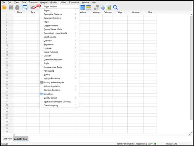 تعتبر هذه القائمة من أهم القوائم في البرنامج؛ حيث تحتوي على معظم الاختبارات والتحليلات الإحصائية، ومن خلالها يمكن إجراء الإحصاء الوصفي، وتحليل الارتباط، واختبارات الفروق بين المجموعات وغيرها من التحليلات؛ ولذلك يعتمد عليها الباحث بشكل أساسي في تحليل البيانات.